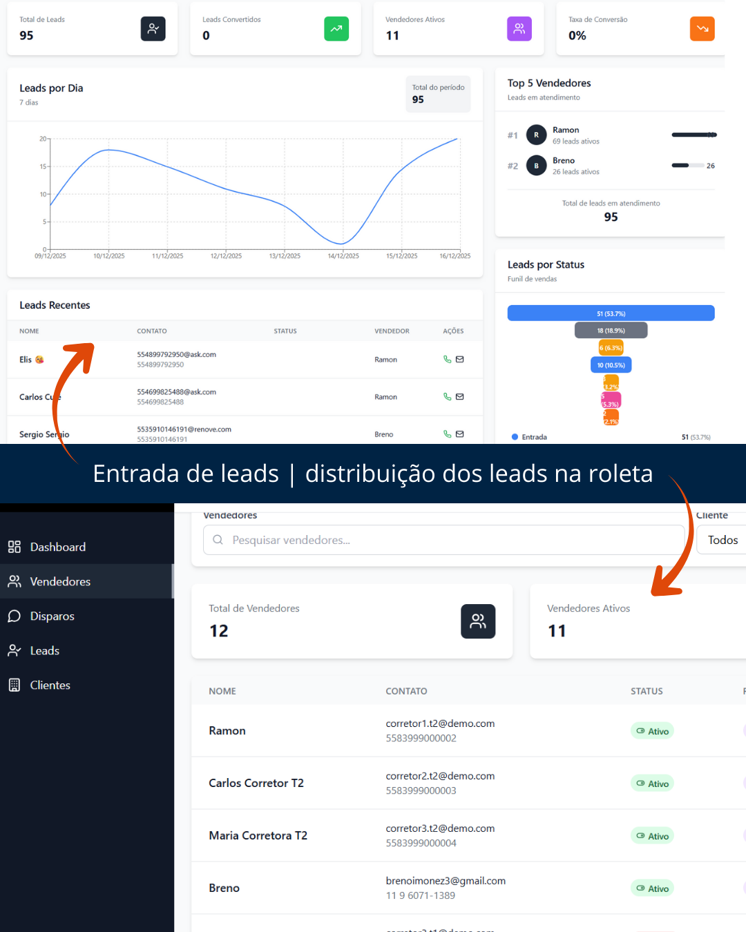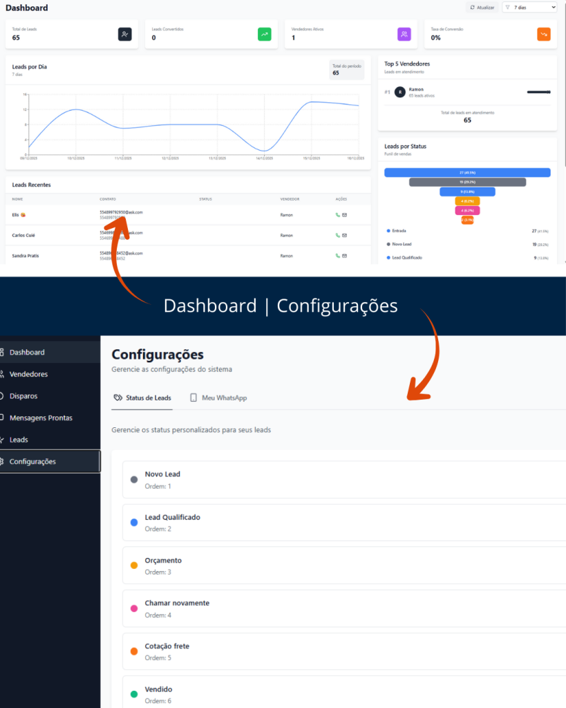 Os status são atualizados automaticamente conforme a conversa evolui, e temos disparos automáticos e follow-ups constantes com os leads.